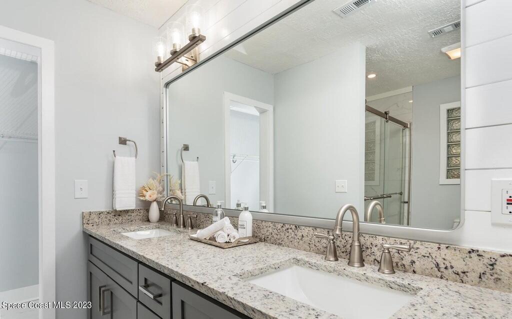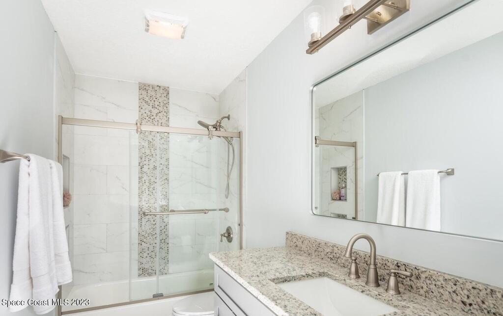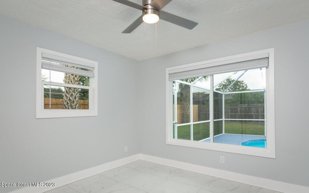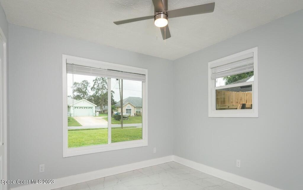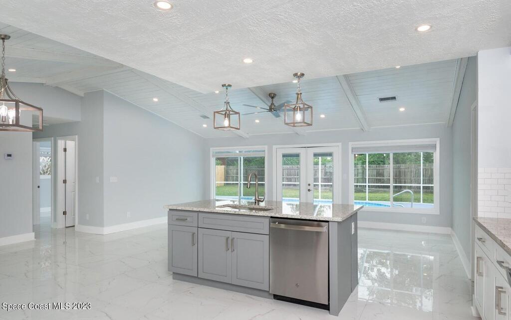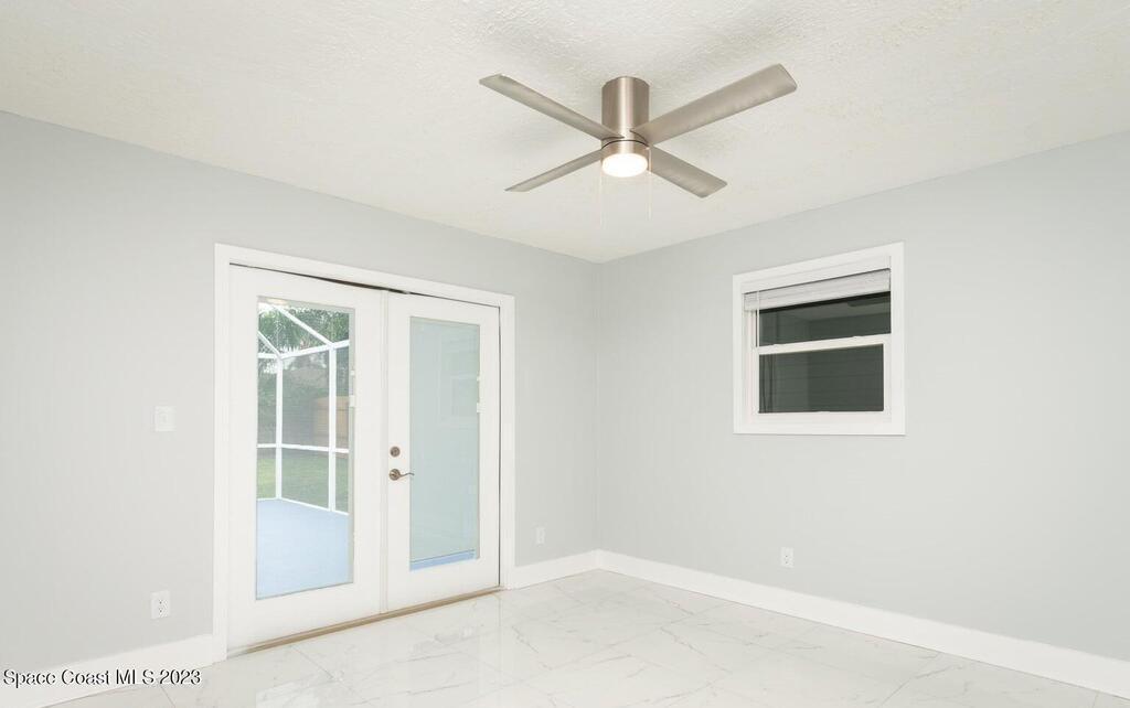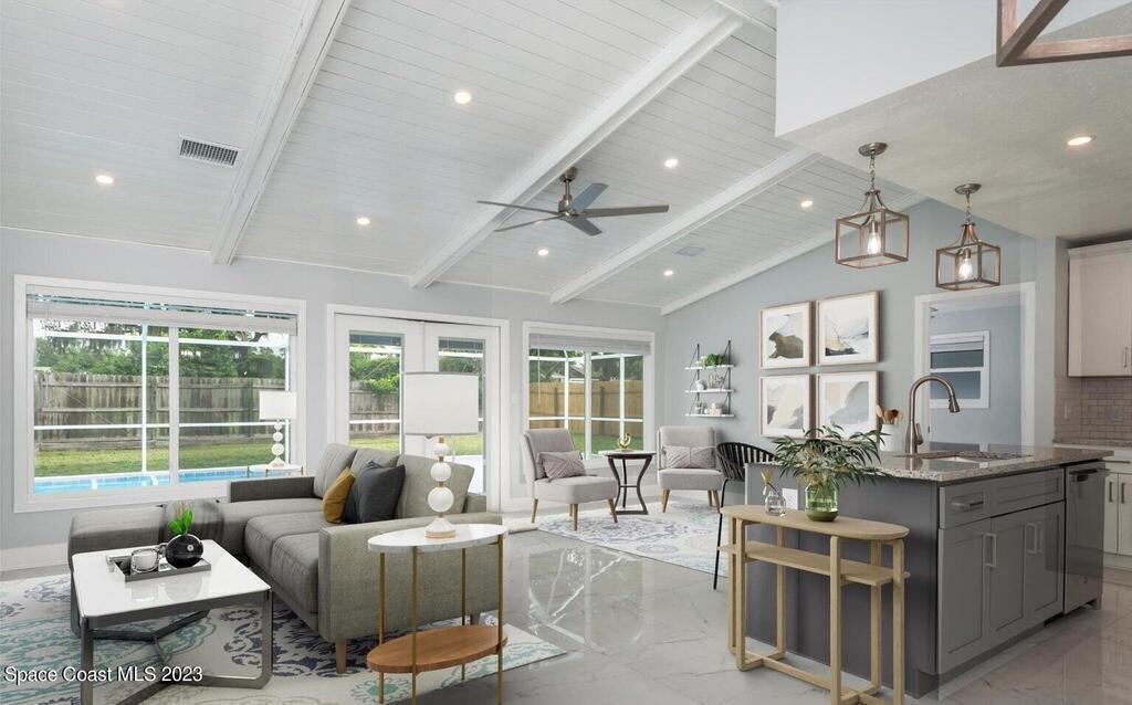 FULLY REMODELED 3 bedrooms/ 2 bathrooms single family home. All upgrades done in 2023!! Beautiful porcelain tile throughout and wooden beams in the living area. ALL BRAND NEW stainless steel appliance, kitchen cabinets, granite countertops, and a large walk-in pantry. Impact sliding glass windows and french doors. Double sink vanity in master suite with a walk-in shower/ closet. NEW roof, A/C, fence, and paint in & out. Private fenced in backyard with screened in, in-ground pool. Huge driveway for boats/ RV parking. Lush landscaping w/ a wonderful quiet neighborhood. Walking steps to elementary school. XLNT location with easy access to KSC, 528, US-1, restaurants, services, amenities, and just 45 mins to Orlando/ attractions. MUST SEE!!