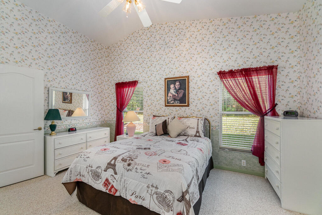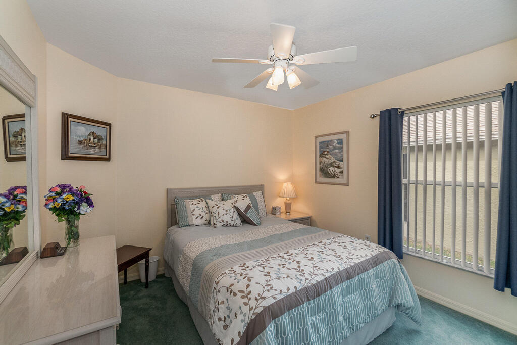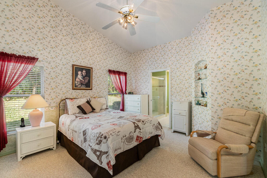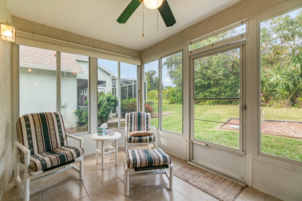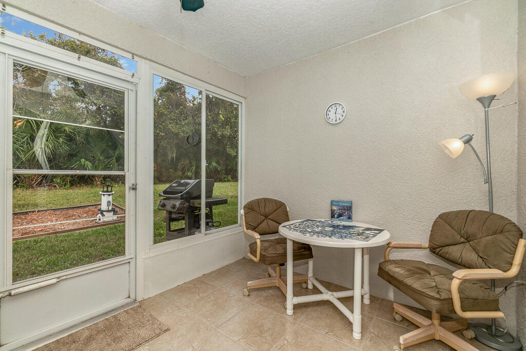 Well cared for by original owner. Only lived in 6 months out of every year since built. Jim Morris built with superior foam block exterior walls and interior rounded corners. Nice open floor plan, kitchen has long breakfast bar and opens into family room and dining room is off to the side. Plenty of kitchen cabinets and large pantry added. Cabinets have been resurfaced + crown molding. Spacious primary suite. Screen porch is tiled and enclosed. No back neighbors, preserve like view. All appliances stay including washed and dryer, Electric and accordion storm shutters, laundry sink. Located on a cul-de-sac street in a gated community. Great NE pal Bay location. Close to shopping, restaurants, L3 Harris and more. Roof replaced 2019. Meticulously maintained. Furniture available