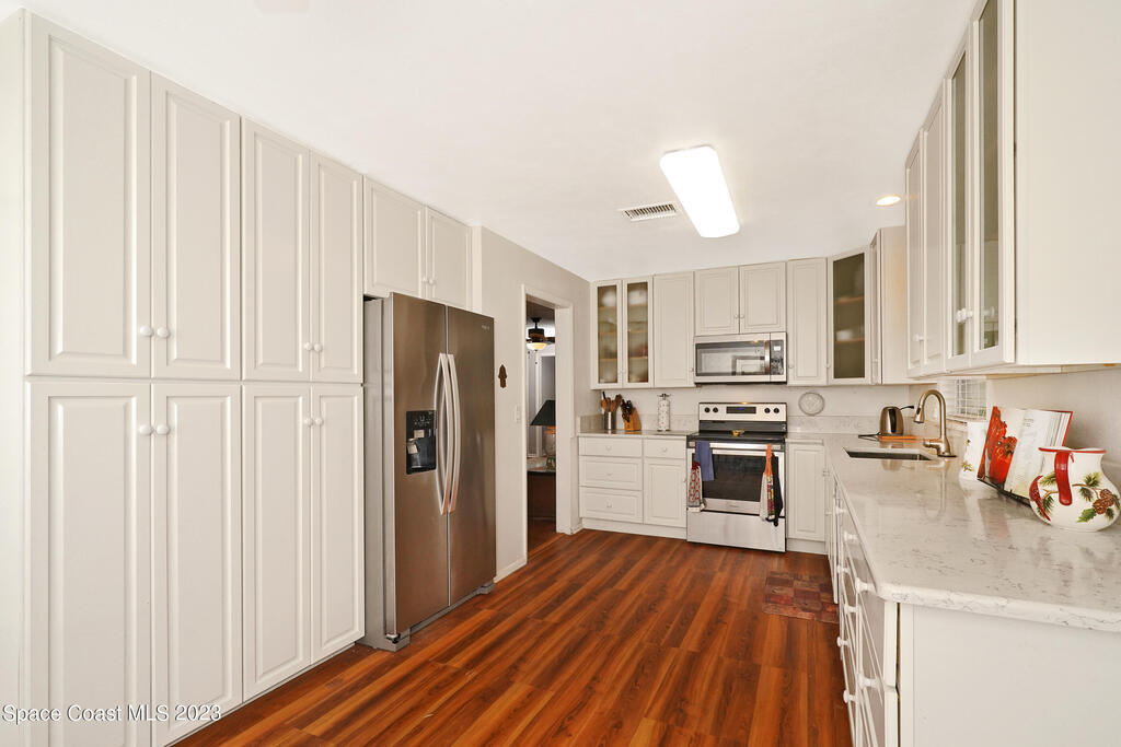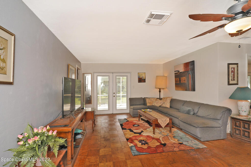 REMODELED Home with lots of room for your family! This home features a newer air, water heater, windows, doors and storm shutters. You'll find parquet style flooring throughout and the living area is perfect for variation of furniture placement. Both bathrooms are tastefully remodeled. The kitchen has ample cabinets and counter tops and the stainless steel appliances stay. The owner added pull outs, drawers and a pantry for storage convenience. The breakfast area is ideal for morning coffee with a yard view. The home had some rewire and repiping work in 2023. The living room and kitchen both have french doors leading to the screened porch. And the porch is the length of the home, very roomy! The sprinkler system runs on a timer. The garage is oversized with storage shelving. Won't last!