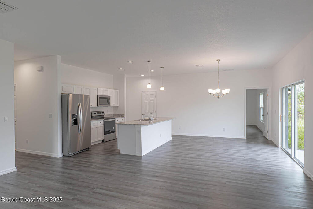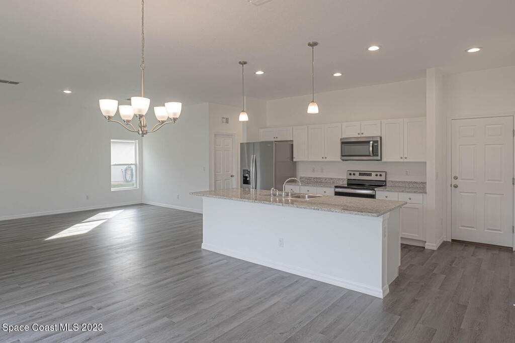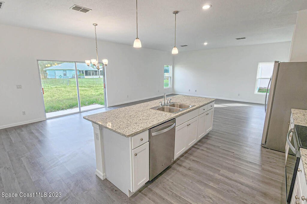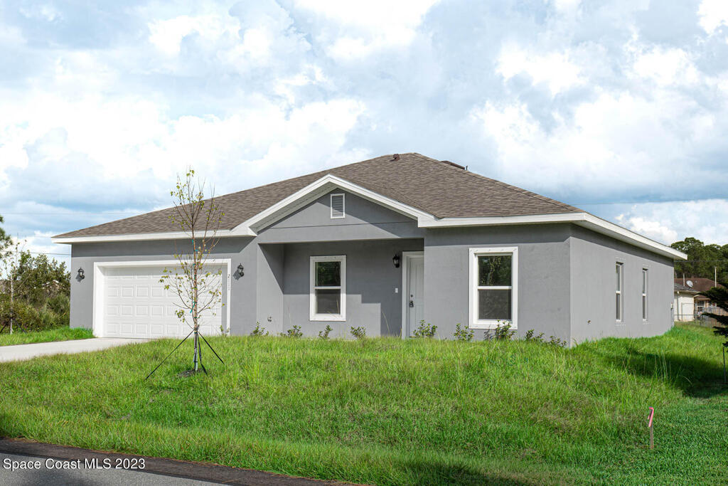 READY TO MOVE IN! This elegant home offers a spacious living area for families and guests. With an open concept floor plan, it features 4 bedrooms, 2 bathrooms, and numerous upgrades. Enjoy energy-efficient stainless steel appliances, solid stone countertops, modern cabinets, and a convenient two-car garage. The master retreat includes a walk-in closet. Located in Palm Bay, residents have easy access to golf courses, beautiful beaches, and amenity-packed parks. Don't miss out on this premier property in a prime location!