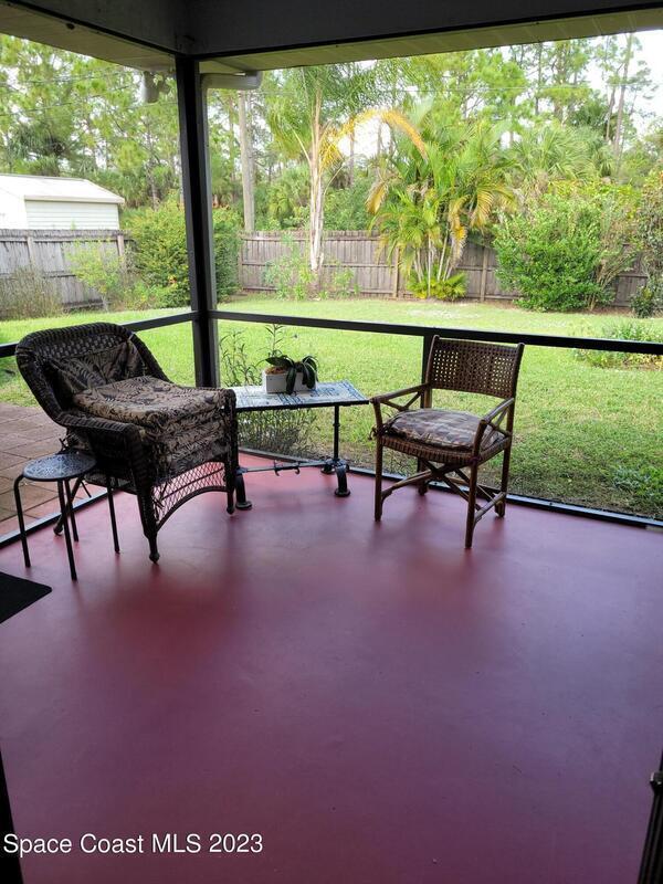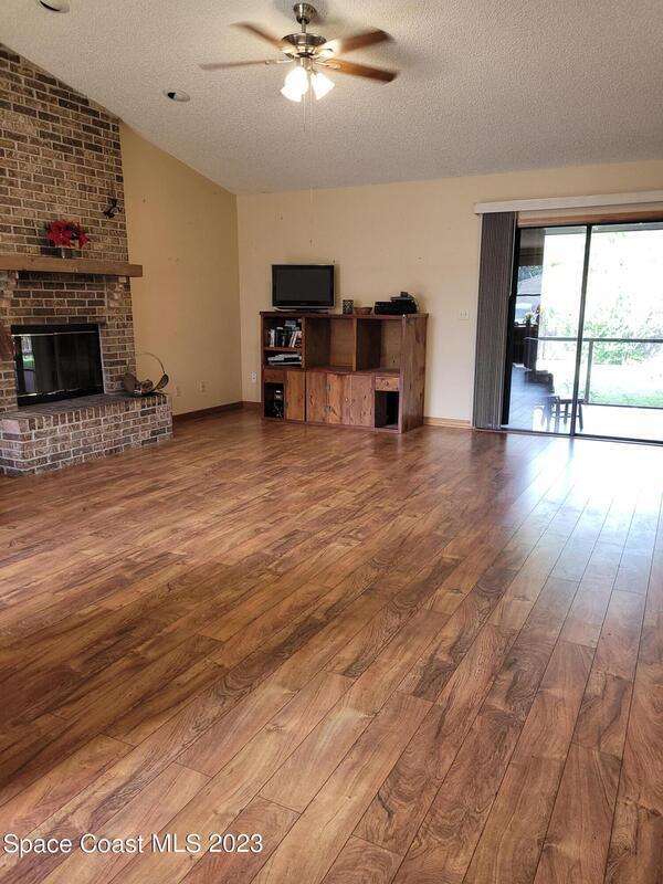 This well maintained home with split floor plan has a spacious primary bedroom with walk in closet and slider to the screened patio, fireplace in living room, no carpet, accordion shutters, screened Florida room, fenced, and new AC.